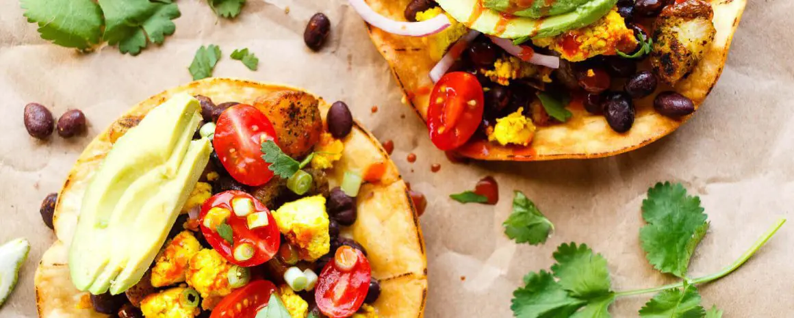 Déposer sur les tortillas de maïs frites les pommes de terre grelots, les haricots noirs, le tofu brouillé et les garnitures au choix (coriandre, tomate, oignon, avocat, sauce piquante).