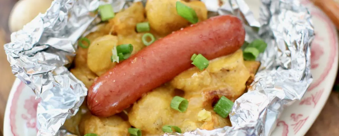 These Campfire Hot Dog Potato Packets are perfect for camping or for grilling! Hot dogs or sausages can be used along with diced potatoes, shredded cheddar cheese, barbecue sauce, and seasoning all wrapped up in aluminum foil. An all-in-one meal!