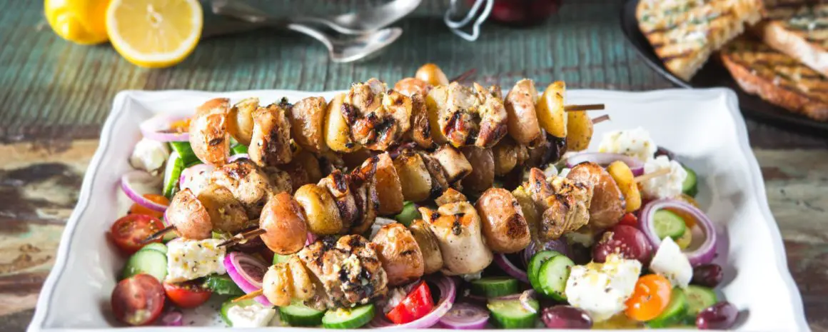 In a large serving dish, put the tomatoes, cucumber, onion rings, feta and olives. Place the kebabs on top and drizzle with the vinaigrette. Serve with grilled pita bread.