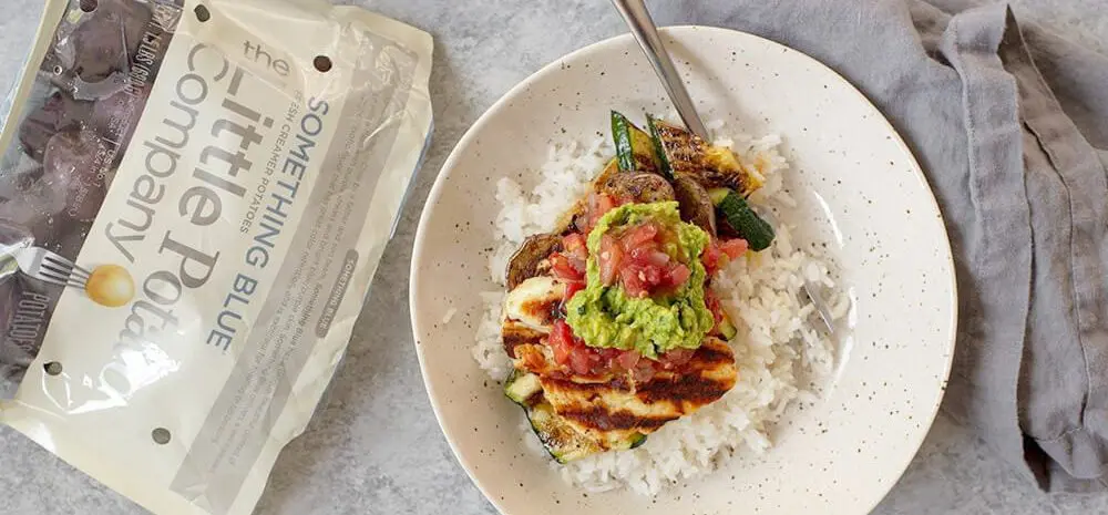 Assemble the bowls: divide the brown rice among four bowls, top with grilled potatoes and zucchini, grilled halloumi. Dollop with guacamole and pico de gallo.