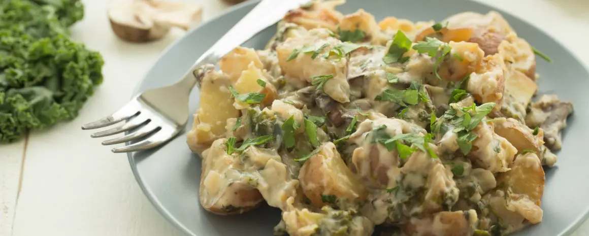The perfect side dish for a festive feast! Kale, mushrooms and little potatoes baked with creamy Parmesan cheese.
