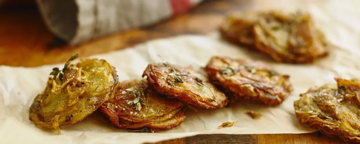Remove foil and bake additional 30 minutes until brown and crispy on the edges, then carefully remove with a small spatula so thyme sprigs are facing up.