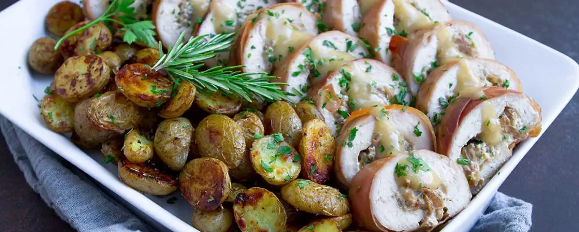 Holiday showstopper! Wrapped in prosciutto and served alongside roasted rosemary potatoes, this stuffed turkey breast is beyond delicious, and surprisingly easy to make.