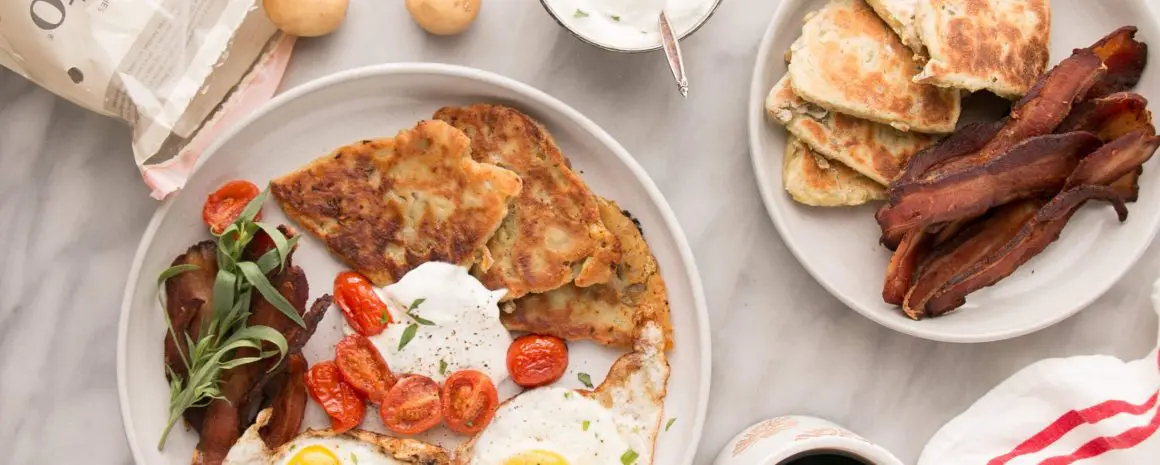 Potato scones are traditionally served after a quick fry in bacon fat (use the same frying pan the bacon was cooked in) to reheat them with a full breakfast (eggs, bacon, fried tomatoes, etc.)