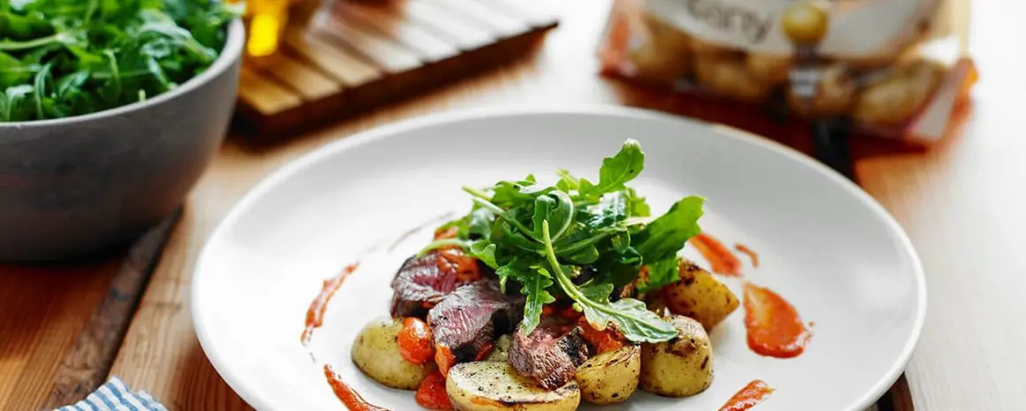 Put some little potatoes on the plate, add thinly sliced sirloin steak on top, and dress with the Romesco sauce. Mix salad with vinaigrette and serve on top of little potatoes and steak.
