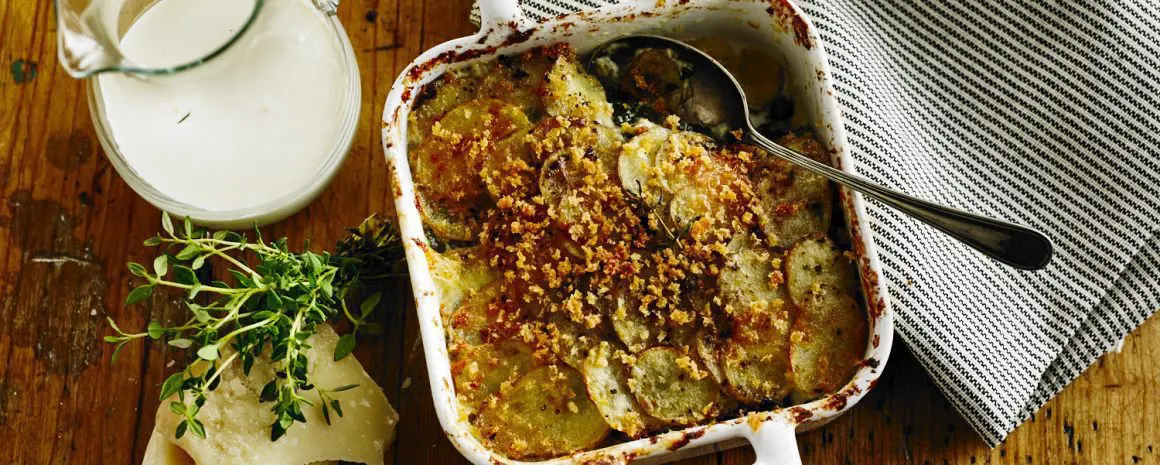 Add layer of sautéed kale, then drizzle of cream, sprinkle of parmesan, 3 to 4 small pieces of Taleggio, thyme leaves, salt and pepper. Repeat 2 to 3 layers depending on the size of your casserole. For the top layer just use potatoes, cream, parmesan, thyme tip in centre and scatter bread crumbs evenly.