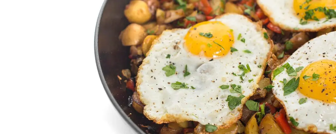 This hearty vegetarian hash breakfast skillet is packed with peppers, potatoes and onions then topped with protein-packed eggs cooked to order.